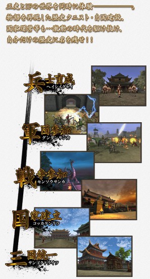 魏、呉、蜀から独立して、なんと新たな国を建国可能!自分の国家に英雄を集結させ、三国の世界に新たな歴史を刻み込む事が出来ます。さぁ、「戦友」という仲間と共に偉大なる功績を築き上げて行こう!