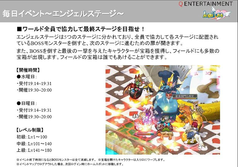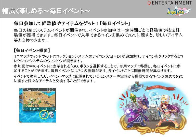 君塚氏:エンジェルラブオンラインでは今までPvPやGvGといったイベントを毎週決まった曜日に開催していたんですが、そこへ7種類の時間コンテンツを追加して、タイトル通り毎日イベントを開催することになりました。この毎日イベントでは専用のコインが貰えまして、このコインを集めればレアな装備品や、一部の課金アイテムとも交換したりできます。とはいえ、交換するには相当な枚数のコインが必要になるので、地道にイベントに通い続けなければいけませんけどね。さらに、勝敗に関わらず参加するだけで経験値も貰えるので、初心者の方も上級者の方もこぞって参加していただければと思っています。