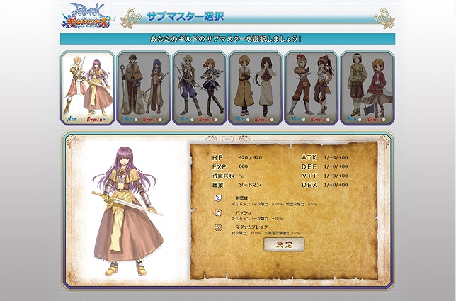 ゲームにログインしたら、最初にプレイヤーの分身となるギルドマスターとメインキャンプの名前を登録し、戦友となるサブマスターを1次職であるソードマン/マジシャン/アーチャー/アコライト/シーフ/マーチャントの6職種から選択。
