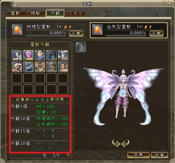 一定数以上の「霊獣外観」を収納すると、「外観」ウインドウ左下の「収集数による上昇効果」が緑色に点灯し、キャラクターと霊獣に効果が付与されます。