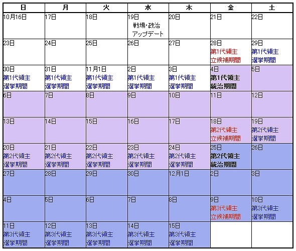 - 領主立候補者の競争期間(ユーザー投票期間): 10/29(土)18:00~11/4(金)17:59