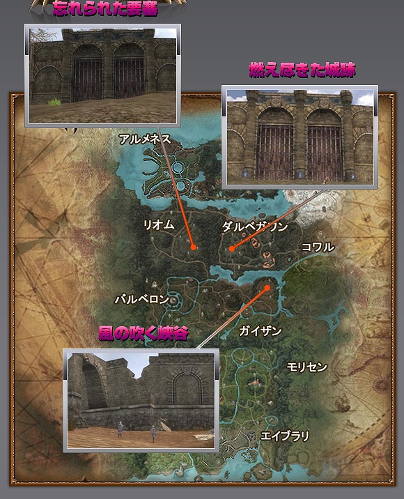 リオム地域の「忘れ去られた要塞」、ダルベガワン地域の「燃え尽きた城跡」、ガイザン地域の「風の吹く峡谷」。レベル制限解除と共に、3地域の硬く閉じられていた門が開きます。