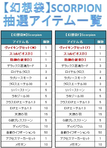 「幻想袋Balance」の販売が終了し、新たに「幻想袋Scorpion」の販売を開始しました。今回の大当たりアバターは、テクニカルな魅力あふれる「ヴァイキングセット」です。又、キャラクターの星座によって真価を発揮する、輝く頭装備「スコルピオス[1]」と、インパクト大な背装備「防御の紋章[1]」も新たに登場しました。