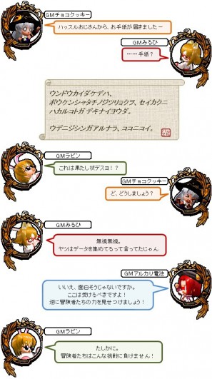2011年11月2日(水)まで開催中の「ハロウィン大運動会」のイベントNPC「ハッスルおじさん・改」からGM(ゲームマスター)たちのもとへ、1通の手紙が届いたようです・・・。