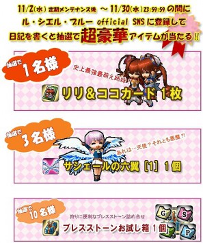キャンペーン期間中、「ル・シエル・ブルー official SNS」の新規会員を登録し、日記を投稿された方の中から抽選でゲーム内アイテムをプレゼントいたします。