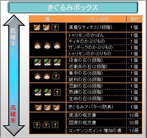 ※「きぐるみボックス」で当たるアバターは、ソーマ、シュバルマン、イリシア、ナギ、ルコ、エルピントス用となります。
