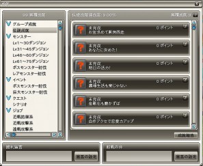 この称号は種類により様々な効果があり獲得すると称号を設定しなくてもその効果を得ることができます。成就ウィンドウに新たに「グループ成就」の項目と、その中に「伝説成就」の項目が追加されます。成就ウィンドウのグループ成就項目内では、各グループ成就の右側にある「?」マークをクリックすると、新たにウィンドウが開き、グループ成就の達成条件に該当する成就の種類や達成状況を確認できます。