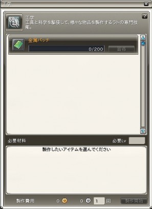 工学はラト専用の種族生産スキルで、各種特殊アイテムを製作できます。アイテムを製作する事により製作経験値が上昇し、製作経験値が上限に達すると新しいアイテムの製法を習得することができます。