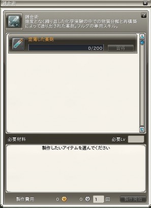 錬金術はフルグ専用の種族生産スキルで、各種薬剤やアイテムの製作ができます。アイテムを製作する事により製作経験値が上昇し、製作経験値が上限に達すると新しいアイテムの製法を習得することができます。