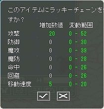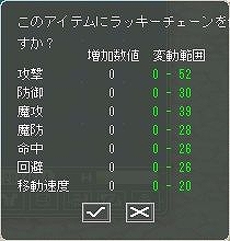 ラッキーチェーンを装備アイテムに使用すると、確認ウィンドウにラッキーチェーンで変動可能なステータスの範囲と現在付与されているオプションステータスが表示されます。確認ウィンドウ下部の決定ボタンを押すと、使用したアイテムのオプションステータスが変動します。元々オプションステータスが付与されているアイテムに使用した場合、元々のステータスよりオプションステータスが低くなる場合もありますのでご注意ください。