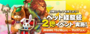 皆様よりご好評のイベント「ペット経験値2倍イベント」を本日より開催いたします。期間中、ペットがモンスター撃破した際の獲得経験値が通常の約2倍となります。このチャンスを逃さず自慢のペットを育てよう!