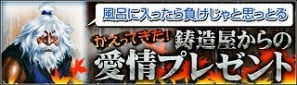 期間中、あふれんばかりの感謝の気持ちから、鋳造屋・欧冶子が皆さまへ、素敵な初秋の贈り物をご用意しております。ただし、恥ずかしがり屋でめっきり涼しくなってきた今日この頃でも絶対に風呂に入らない彼は、贈り物をするかどうかを、アイテム「紫仙玉」「紫仙壁」を使って鋳造してくれた方の顔色をうかがって、タイミングをはかっている様子。ぜひこの期間に鋳造屋をご利用いただき、欧冶子から素敵な贈り物を受け取ってあげてください。