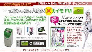 エヌ・シー・ジャパンは、「タワー オブ アイオン」において、11月21日よりファミリーマートにて「Connect!AION SPECIAL BOOK」販売開始を発表、『「タワー オブ アイオン×カイモ FM」Dreaming Winterキャンペーン』を開始する。