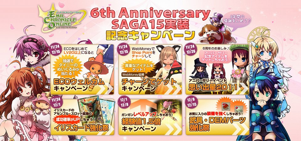 ガンホー・オンライン・エンターテイメントは、「エミル・クロニクル・オンライン」において、大型アップデート「SAGA15:永遠の絆」を実装、また、12月3日にニコニコ生放送にて「ECO祭2011」を放送すると発表した。