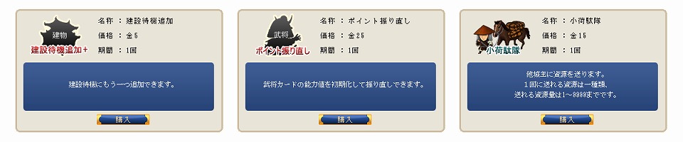 4.便利機能「建設待機数の増加」、「武将ステータスポイントの振り直し」、「小荷駄隊(資源運搬)」を追加