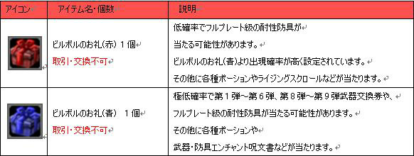 イベントアイテム「ホットハート」を1個渡すと、ビルボルが下記リストのアイテムからランダムで1つプレゼントしてくれます。