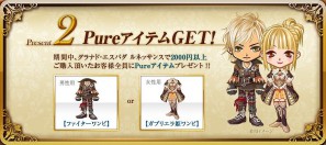 期間中、「グラナド・エスパダ ルネッサンス」で2,000円以上ご購入頂いたお客様全員にPureアイテム【ファイターワンピ】(男性用)か【ガブリエラ姫ワンピ】(女性用)のいずれかをプレゼント!!