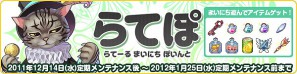 本日12月14日(水)から2012年1月25日(水)定期メンテナンス開始前までの期間中、「らてーるまいにちぽいんと」(らてぽ)を実施いたします。ゲームにログインするとポイントが貯まり、貯まったポイントに応じて様々なゲーム内アイテムをプレゼント! ぜひこの機会にログインして「トキメキファンタジー ラテール」をお楽しみください!