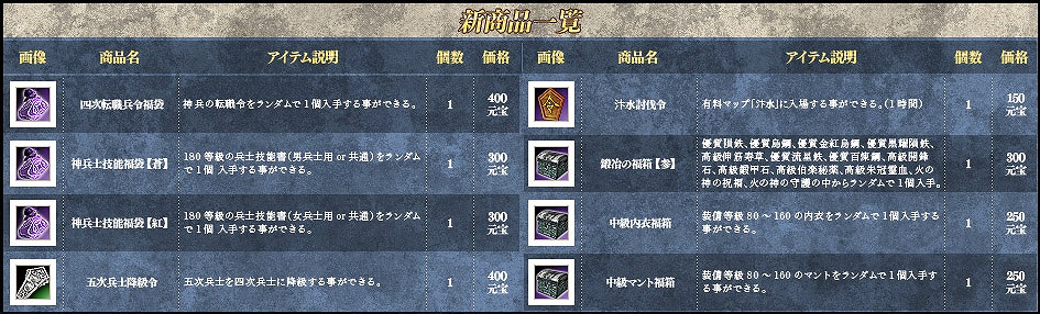 ゲーム内アイテムモール「三国商店」に様々なアイテムが新たに登場いたします。「神兵」の転職令がランダムで入手できる「四次転職兵令福袋」や「神兵」や「英勇兵」に等級180の技能を覚えさせる「神兵士技能福袋」が目玉です。また、兵士を連れるのに不可欠な能力「統率」が上がる装備「中級内衣福箱&中級マント福箱」や、更なる強化に挑戦できる「鍛冶の福箱【参】」など、魅力的な商品が目白押し!一度「三国商店」を覗いてみよう!