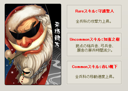 先日一部のみ発表した限定カード「来栖親方(くるすうぇーかた)」が、ついにゲーム内に降臨いたします。キャンペーン期間中、TheBushoくじ:「SILVER」、「SILVER+」を引くと、「来栖親方(くるすうぇーかた)」が手に入るかもしれません。ぜひこの機会に「来栖親方(くるすうぇーかた)」を使用し、お気に入りの武将にクリスマスオリジナルスキルをつけましょう!