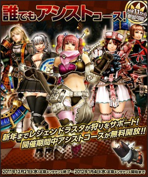 「誰でもアシストコース!」開催期間中は、すべてのハンターの皆さまに「アシストコース」が自動的に無料で付与されます!!強力な11人のレジェンドラスタが、ハンターの狩りを直接サポートしてくれます。剥ぎ取り素材の追加報酬にも期待できます!