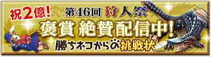 第46回狩人祭「勝ちネコからの挑戦状」では、全サーバーの総入魂数に応じて褒賞がグレードアップする形式となっておりました。ハンターの皆様の情熱により、見事最上位目標である2 億魂を達成いたしましたので、3週連続でお得な褒賞クエストを配信いたします。本日より、第3 弾といたしまして古龍種の汎用素材が手に入る「蛮竜のなわばり」や、「討伐の証」が2倍手に入るクエストなど、お得なクエストを配信いたします!獲得できる褒賞の一覧や詳しい内容、参加方法につきましては、MHF 公式メンバーサイト内の特設サイトをご確認ください。