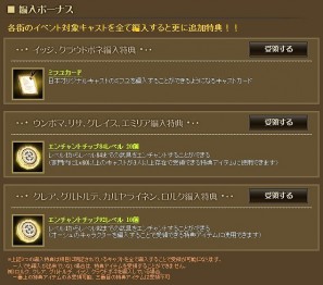 リボルドウェ、コインブラ、オーシュ各街の対象キャストをそれぞれ編入すると、編入ボーナスを獲得!特にリボルドウェで「イッジ」「クラウドボネ」の2人を編入すると・・・絶大な人気を誇る日本オリジナル キャスト「ミフユ」を編入することができる【ミフユカード】を入手可能!普段は仲間にすることができない「ミフユ」を、この機会にあなたの家門に加えよう!