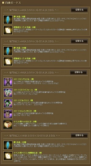 様々なキャストを編入したら、お気に入りのキャストを育てよう!ゲーム開始時のベーシックキャストを含む、全てのキャストが対象となる育成ボーナスでは、家門内の3キャストが、レベル40、レベル60、レベル80、そして、レベル100となるまで、レベルに応じて、様々な“育成ボーナス”を進呈!クエストやアイテム交換で使える輝く水晶、脱初心者防具セット、そしてレベル100を迎えたキャラクターのレベルキャップを開放する【イベント用ベテラン覚醒秘伝書】など、ゲームの進行をサポートする各種特典を利用しよう!