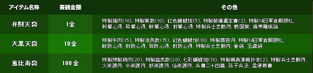 イベント期間中、「王殿の広場」になんと「賽銭箱」が登場します。神様にお願いをしてお金を入れると、金額毎に「弁財天袋」、「大黒天袋」、「恵比寿袋」が返ってきます!使用するとキャラクターの基本ステータス「智力」「体格」「統率」がそれぞれ+5の「孟徳新書」を獲得するビックチャンスですのでどうぞお見逃しなく。