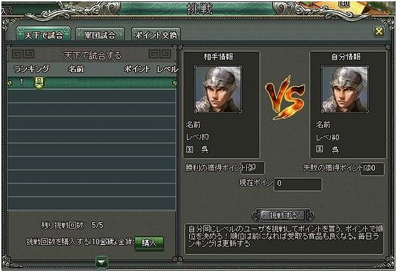 5.自分より高い順位のプレーヤーに挑戦して、勝利したら相手の位置に取って代わります。同時に、失敗側が一位格下げされます。