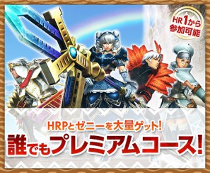 「誰でもプレミアムコース!」開催期間中は、すべてのハンターの皆さまに「プレミアムコース」が自動的に無料で付与されます。HRP とゼニー大量獲得のチャンスです!!