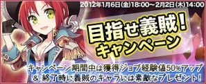 ※2012年2月2日(木)のメンテナンス時に現在のジョブが義賊のキャラクターである事がキャンペーン対象の条件となっております。義賊の転職条件を満たしている場合や義賊に転職した事があるキャラクターでありましても、メンテナンス時点で現在のジョブが義賊以外の場合はキャンペーンの対象外となり、アイテムは配布されないためご注意ください。
