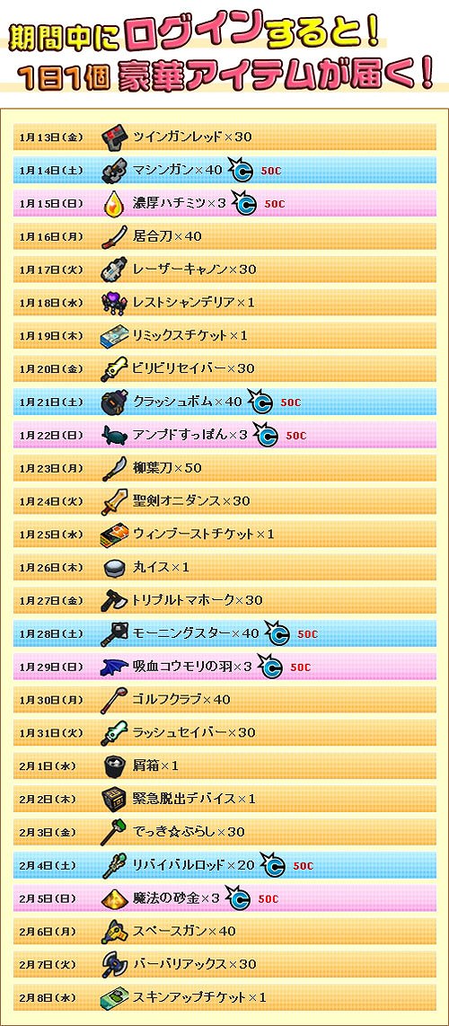 2012年1月13日(金)からお得なアイテムが毎日貰えるログインキャンペーンを実施いたします。