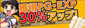本日1月11日(水)定期メンテナンス終了後から、1月18日(水)定期メンテナンス開始前までの期間中、全サーバーを対象に経験値&PGが30%アップする「経験値&PG+30%アップイベント」を開催いたします! レベルアップの大チャンス! この期間をお見逃しなく!