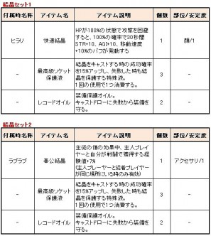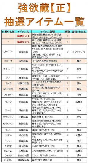 ※当選確率は、リストのアイテム「健康な結晶」を一番下として、上に行くほど低い設定となっています。