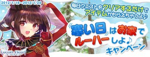 ガマニアデジタルエンターテインメントは、「ルーセントハート」において、明日1月18日より、アバターや便利なアイテム等をプレゼントする「寒い日はお家でルーハーしよ♪キャンペーン」を開催する。