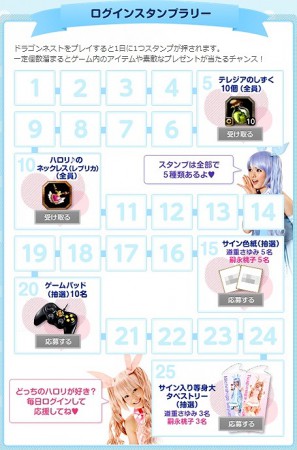 毎日ログインしてドラゴンネストをプレイすると、1日1 つログインスタンプが押されアイテムがもらえるイベントも同時開催中!スタンプが貯まったら「受け取る」ボタンからアイテムを受け取ろう!