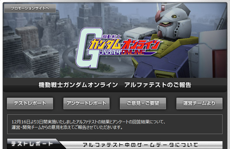 昨年12月に実施した【アルファテスト】にご参加いただいた方を対象にアンケートを実施しました。その回答とゲームに対するご要望について、まとめさせていただいたレポートを「機動戦士ガンダムオンライン」公式サイトに本日公開させていただきました。