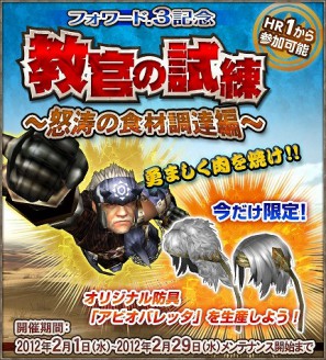 カプコンは、「モンスターハンター フロンティア オンライン」において、大型アップデート「フォワード.3 “未知なる系譜、獣竜種”」を本日2月1日より公開、フォワード.3 記念として「教官の試練 ~怒涛の食材調達編~」を開催、また、「MHF フォワード.3 プレミアムパッケージ」を発売する。