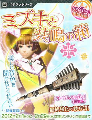 このシナリオでは、チャプターを進めることで、オリジナル武器「オーソルオルガン」(狩猟笛)の生産素材が入手できます。シリーズクエストの1 つのシナリオは、複数のチャプターで構成されています。順番に挑戦し、依頼を達成してください。当イベントの詳細につきましては、MHF 公式メンバーサイト内の告知ページをご確認ください。
