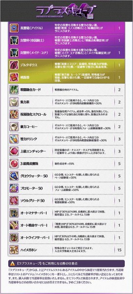 ※「ラプラスキューブ リータ」はリストにあるアイテムの中から抽選で1個当たります。※当選確率はリスト上のアイテム順番として、上に行く程低い設定となっています。
