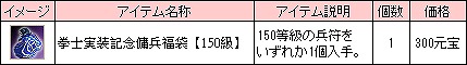 「拳士実装記念傭兵福袋」を使用すると必ず等級150の兵士を1名入手する事が出来ます。「近衛兵」から「英雄兵」までバリエーション豊かなラインナップをご用意いたしましたので、是非ご利用ください。