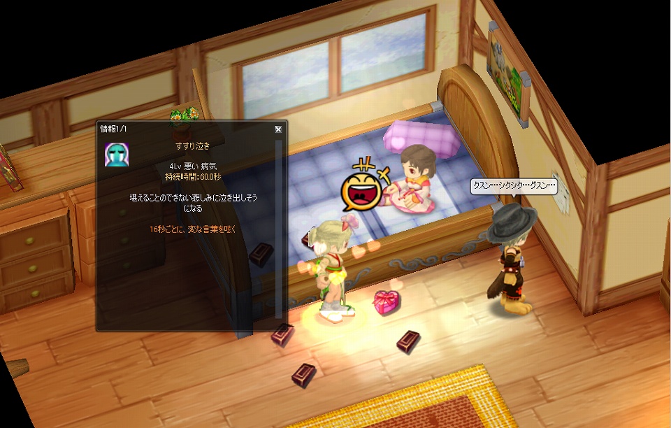自分のキャラクターに一定時間泣き続けるエフェクトが掛かります。ステータスの変化はありません。