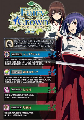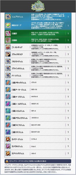 アイテムモールに新作「フェアリークラウン アン」が登場しました。今回の大当たりは、回復スキル発動時に一定確率で強力な「封魔結界」が発動する「エムブラジェム」と、HPが5%以下の際に攻撃をされると、5%の確率で絶大な力「神化」が発動する「神託のオーブ」。「エムブラジェム」を使い、仲間に加護を与えるか、それとも「神託のオーブ」を使い、倒れる前に敵を圧倒して起死回生を図るのか。クエストやパーティーでの行動に加え、PVPにおいても強力な支えとなる今回の大当たり景品は、是非ともゲットしておきたい逸品です。