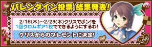 本日2月16日(木)定期メンテナンス終了後から2月23日(木)定期メンテナンス開始前までの期間中、「バレンタイン公約」を開始いたします。本イベントでは、バレンタイン投票で人気No.1に輝いたNPC「クリス・アイオライト」の公約を実施! 「クリスでポン!」のプレイに必要なクロムギアの個数が期間限定で1個になります。