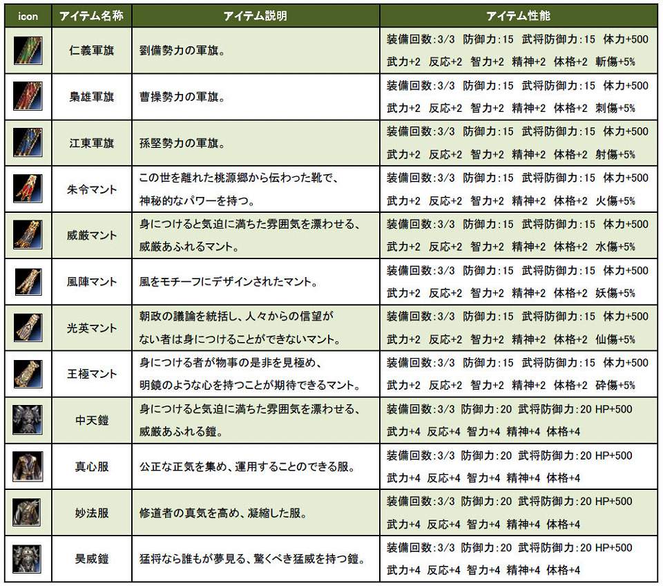 | マントアバターBOX【旗】 | 日本旗、三角旗、号令旗、天軍旗、虎紋旗、仙鶴旗、仁義軍旗、梟雄軍旗、江東軍旗。 | 300元宝 |