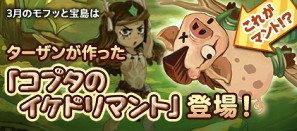モフッと宝島レアアイテム変更!3月のモフッと宝島レアアイテムは、マントアイテム「コブタのイケドリマントボックス」!コブタのイケドリマントボックスから獲得できるコブタのイケドリマントは、防御力やステータスが上昇する性能!更にはターザン衣装などと一緒に装備するとセット効果が発動しちゃいます!
