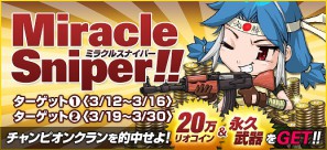 Season1チャンピオンクランを予想して、リオコインや永久武器をもらおう! クロスファイアのキャラクター及びfacebookのアカウントがあれば、どなたでもご参加いただけるイベント「ミラクルスナイパー!」を現在開催中です。ベスト4クランからチャンピオンクランと2位クランに投票してください。みごと的中させた方には素敵なプレゼントが当選します。
