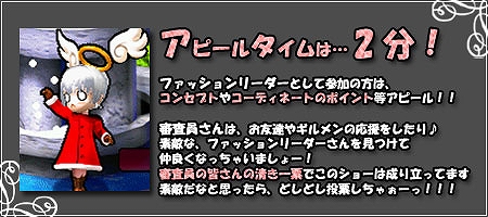 ファッションリーダーは事前にエントリーしていただいた方の中から、各サーバー10名まで抽選を行います。当選された方は、イベント当日、衣装のコンセプトやコーディネートのポイントをアピールしていただきます。
