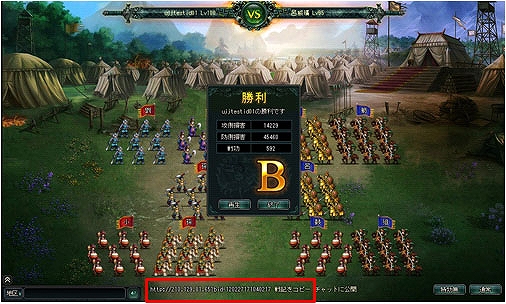 戦闘終了後、画面下部に表示される戦闘結果報告用URL になります。「戦記をコピー」を押すと、URL をコピーする事が出来ます。